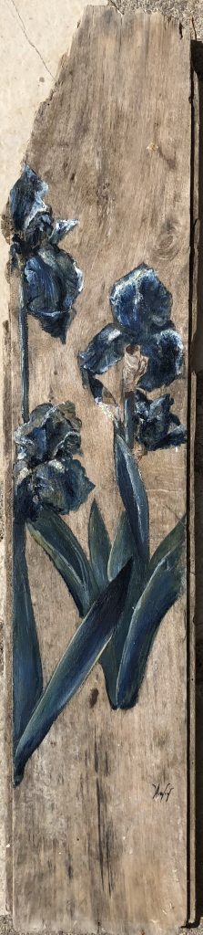 C’est en 2020, pendant le confinement, qu’elle s’y remet après plus de 20 ans d’arrêt. N’ayant ni support ni matériel, elle commence à peindre sur les vitres de sa chambre avec la gouache de ses enfants. C’est une révélation pour elle, et depuis, elle n’a pas arrêté.